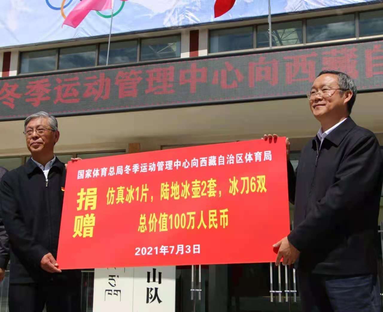 为切实响应习近平总书记关于“带动三亿人参与冰雪运动”的号召,贯彻落实第六次全国体育系统对口支援西藏工作会议精神,宣传北京2022年冬奥会,改善西藏冬季运动发展条件,丰富西藏全民健身体验月的文化内涵,在西藏推广冬季运动项目,7月3日,国家体育总局冬季运动管理中心向西藏自治区体育局捐赠了价值100万元的仿真冰、冰刀、冰壶等设施设备。